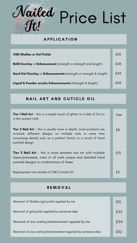 I use CND, Lecente and Light Elegance products which allows me to offer each client the very best service for their individual nails and requirements.